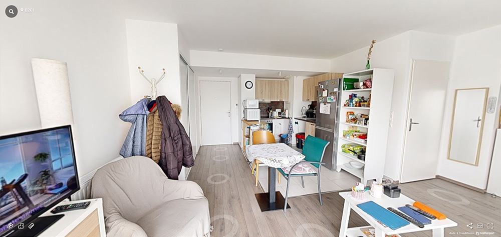 L'appartement se compose d’une entrée donnant sur un grand séjour avec un coin nuit, d’une cuisine équipée (four, micro-ondes et réfrigérateur/congélateur, emplacement pour un lave-vaisselle). Ainsi qu’une salle d’eau avec WC comprenant un emplacement pour une machine à laver.